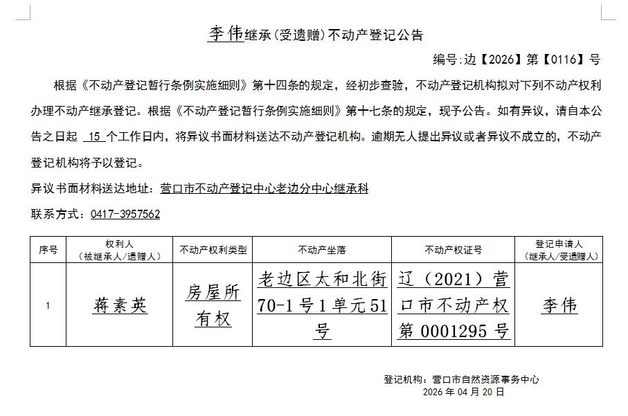 李伟继承(受遗赠)不动产登记公告-公示公告-营口市不动产登记中心