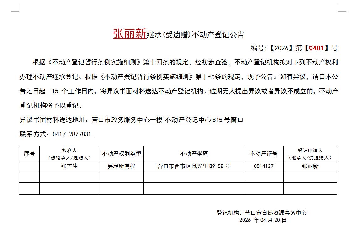 张丽新继承(受遗赠)不动产登记公告-公示公告-营口市不动产登记中心