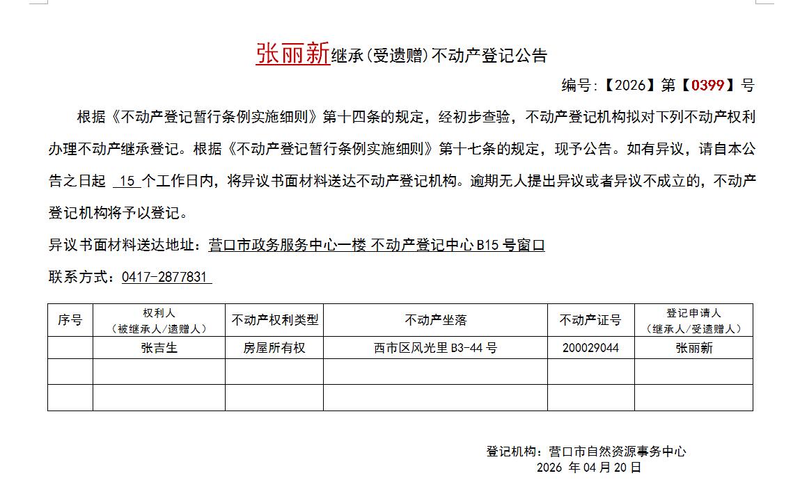 张丽新继承(受遗赠)不动产登记公告-公示公告-营口市不动产登记中心