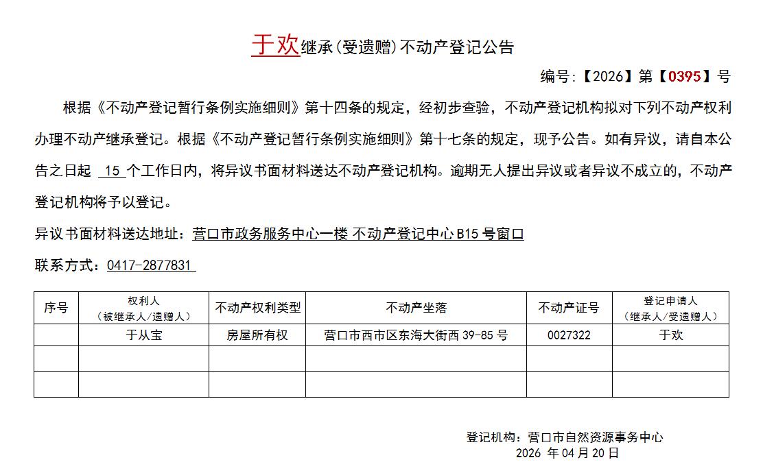 于欢继承(受遗赠)不动产登记公告-公示公告-营口市不动产登记中心
