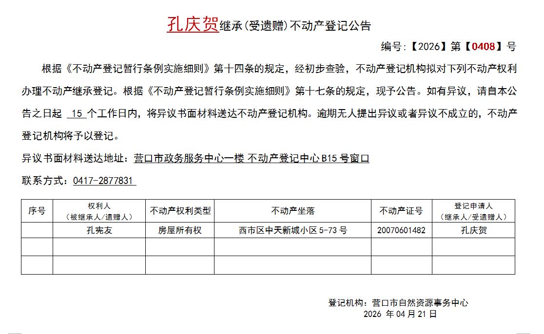 孔庆贺继承(受遗赠)不动产登记公告-公示公告-营口市不动产登记中心