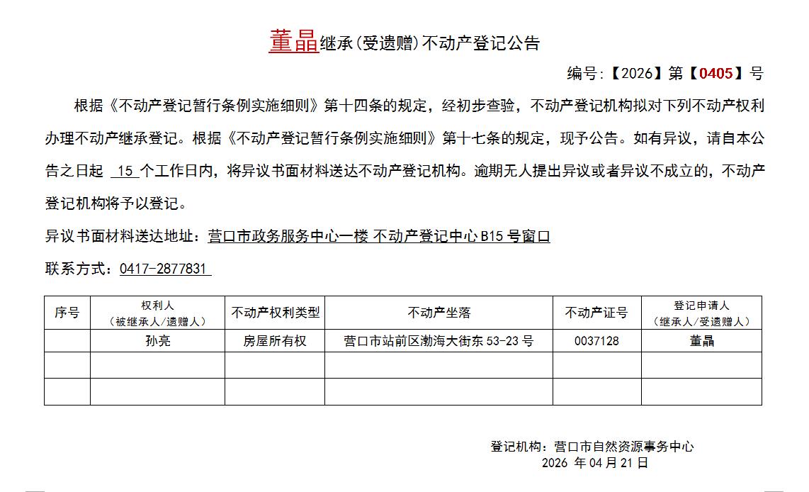 董晶继承(受遗赠)不动产登记公告-公示公告-营口市不动产登记中心
