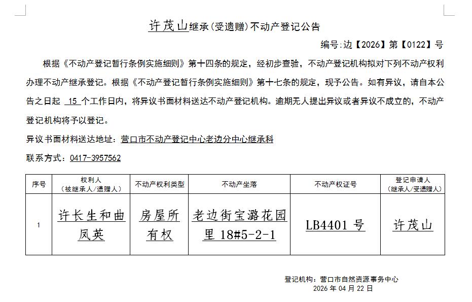 许茂山继承(受遗赠)不动产登记公告-公示公告-营口市不动产登记中心