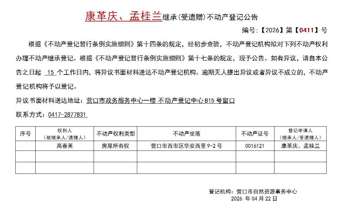 康革庆、孟桂兰继承(受遗赠)不动产登记公告-公示公告-营口市不动产登记中心