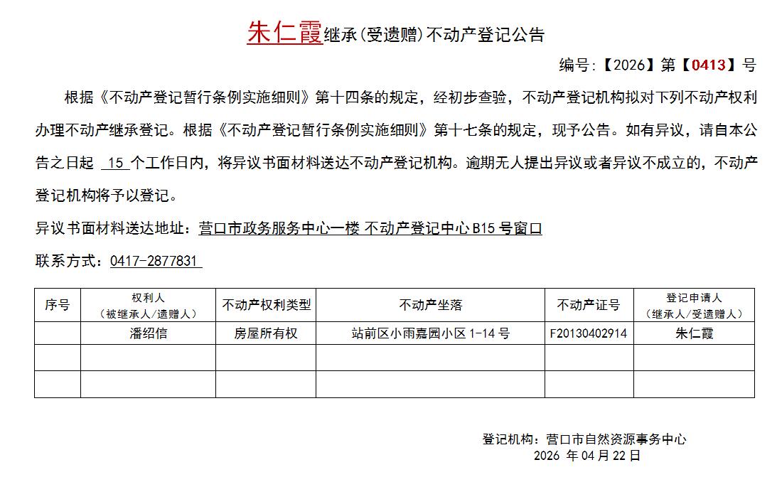 朱仁霞继承(受遗赠)不动产登记公告-公示公告-营口市不动产登记中心