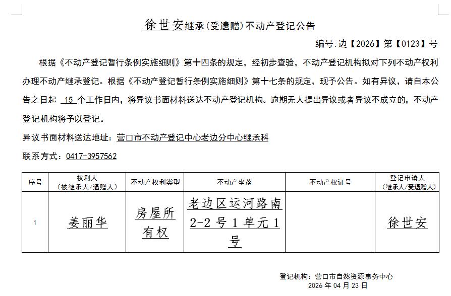 徐世安继承(受遗赠)不动产登记公告-公示公告-营口市不动产登记中心