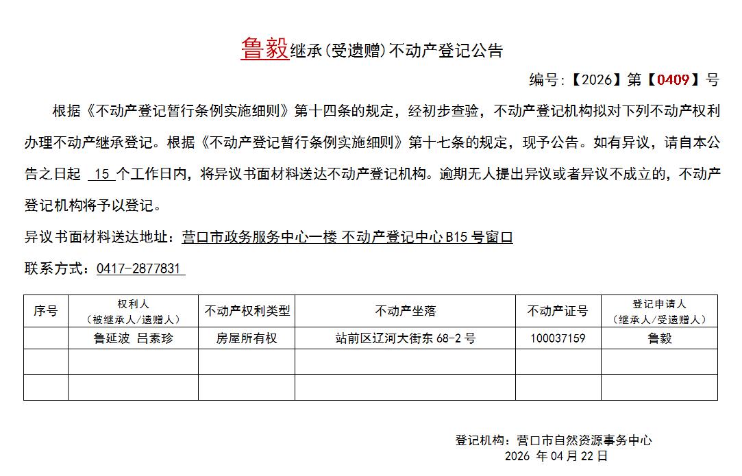 鲁毅继承(受遗赠)不动产登记公告-公示公告-营口市不动产登记中心