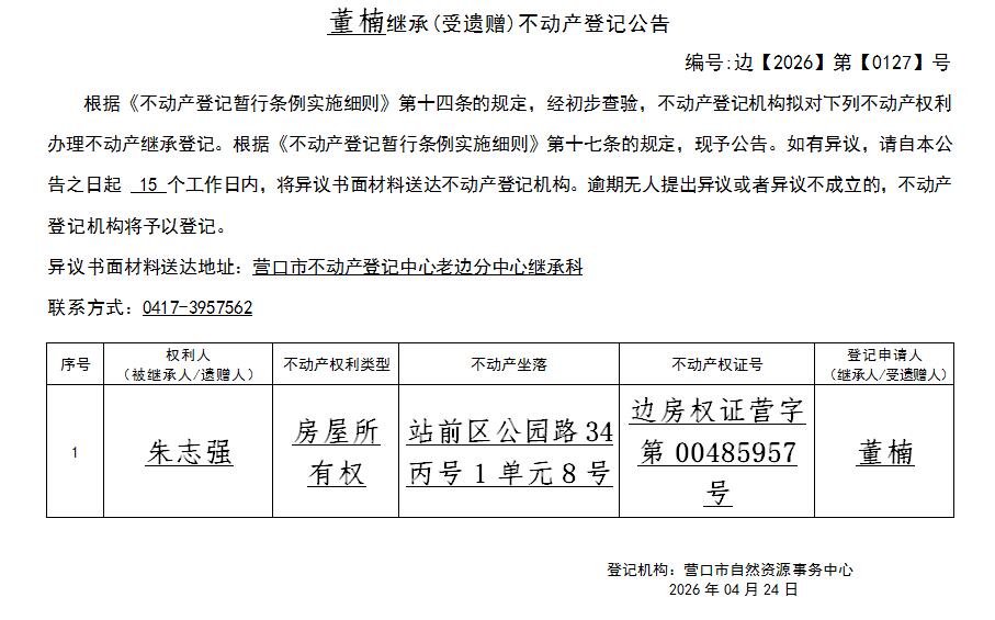 董楠继承(受遗赠)不动产登记公告-公示公告-营口市不动产登记中心