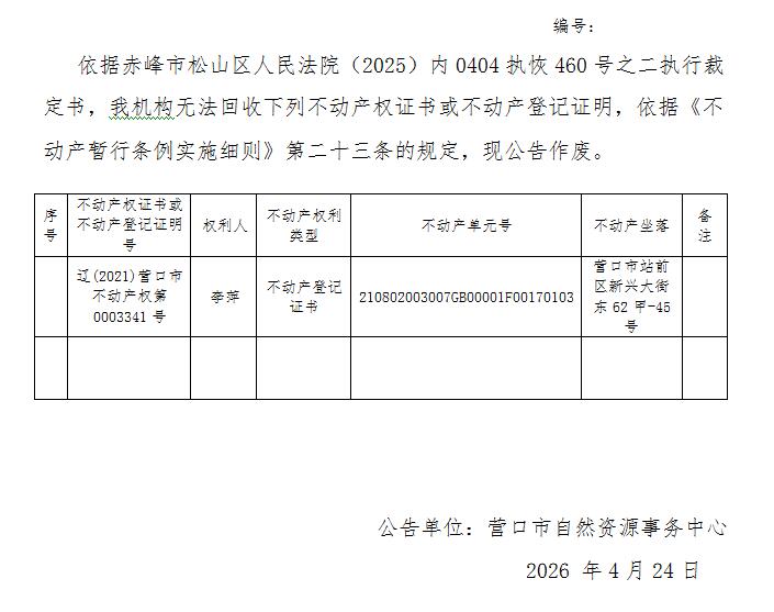 不动产权证书作废公告-公示公告-营口市不动产登记中心