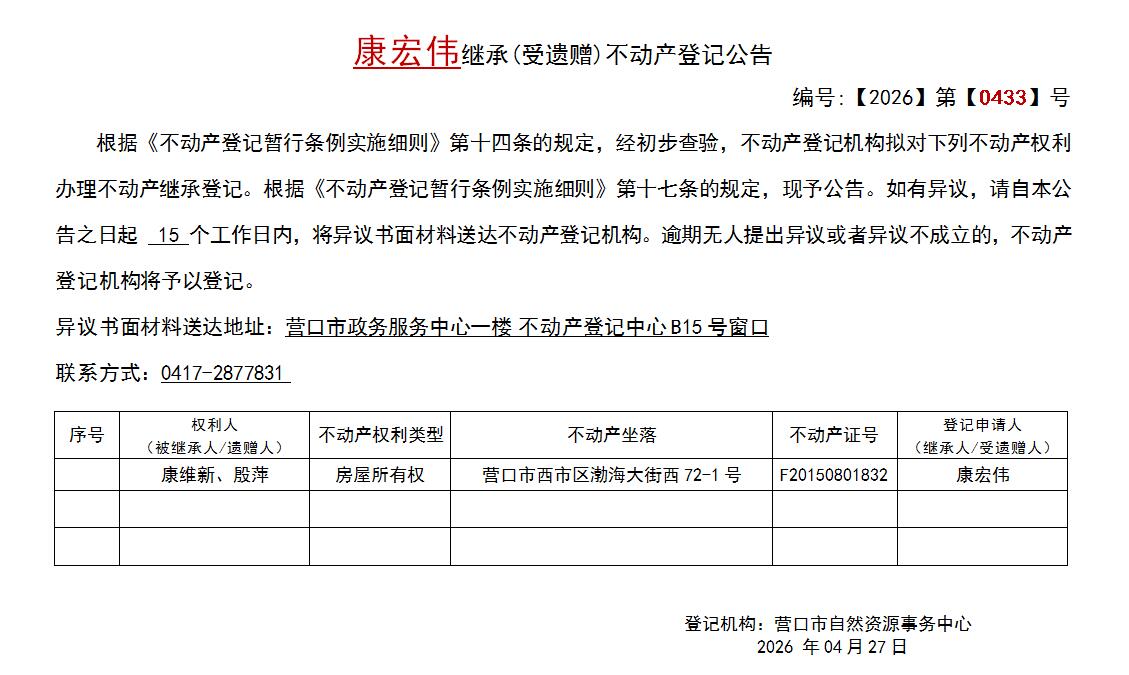 康宏伟继承(受遗赠)不动产登记公告-公示公告-营口市不动产登记中心