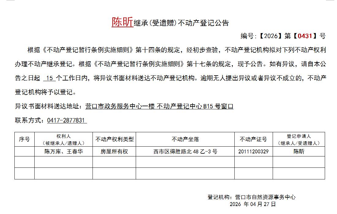 陈昕继承(受遗赠)不动产登记公告-公示公告-营口市不动产登记中心