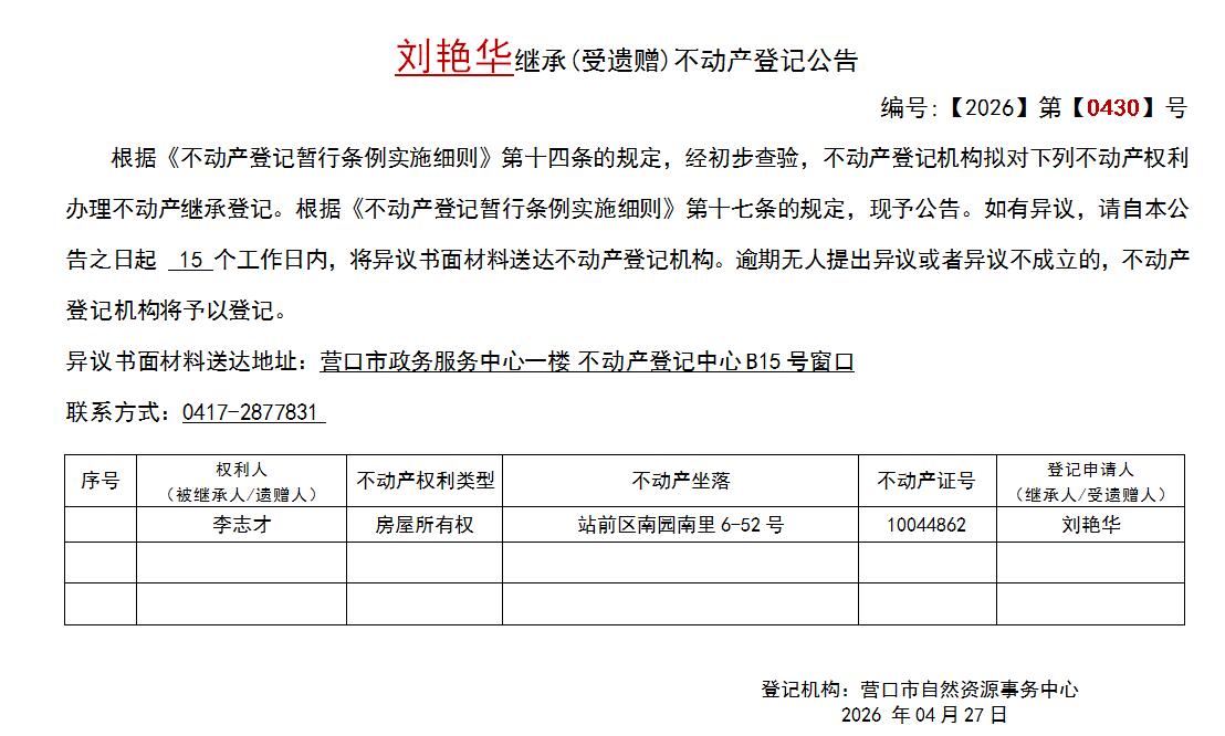 刘艳华继承(受遗赠)不动产登记公告-公示公告-营口市不动产登记中心