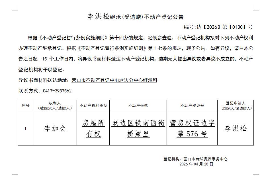 李洪松继承(受遗赠)不动产登记公告-公示公告-营口市不动产登记中心