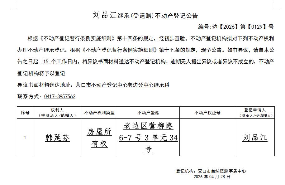 刘品江继承(受遗赠)不动产登记公告-公示公告-营口市不动产登记中心