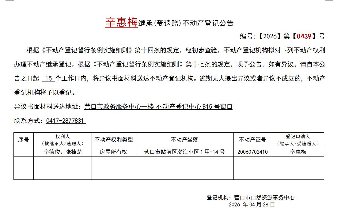 辛惠梅继承(受遗赠)不动产登记公告-公示公告-营口市不动产登记中心