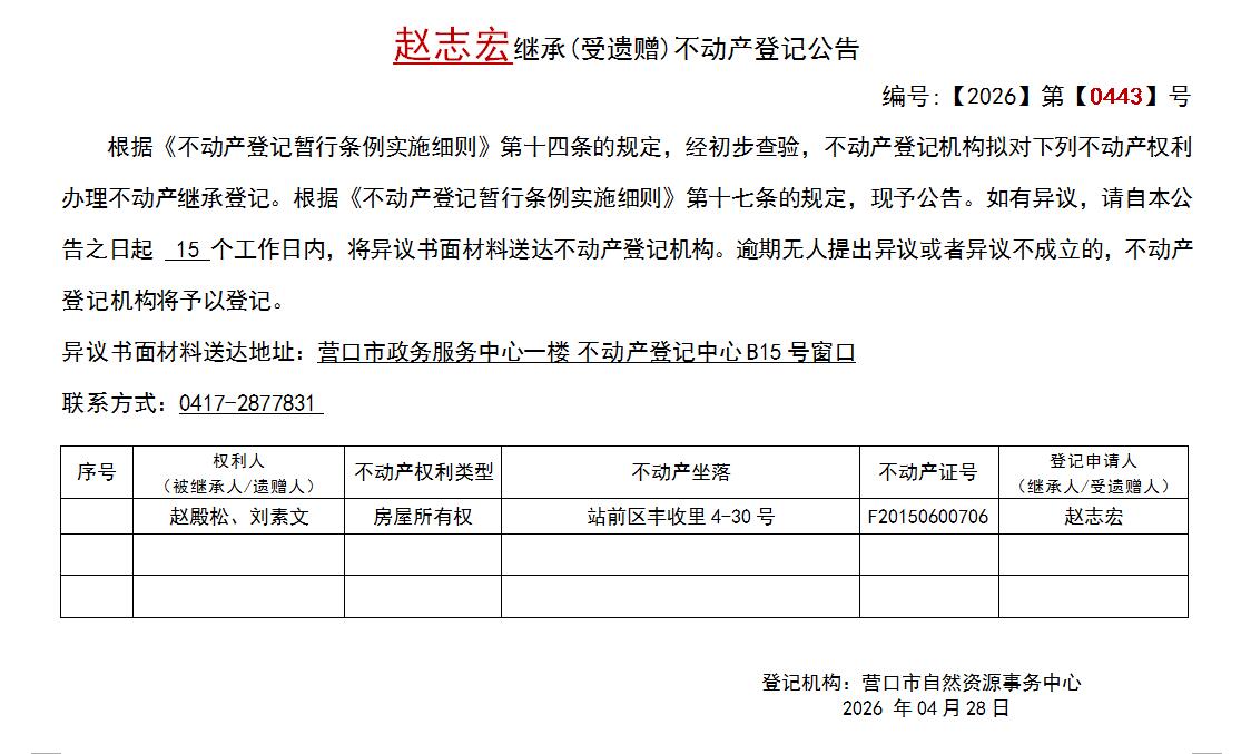 赵志宏继承(受遗赠)不动产登记公告-公示公告-营口市不动产登记中心