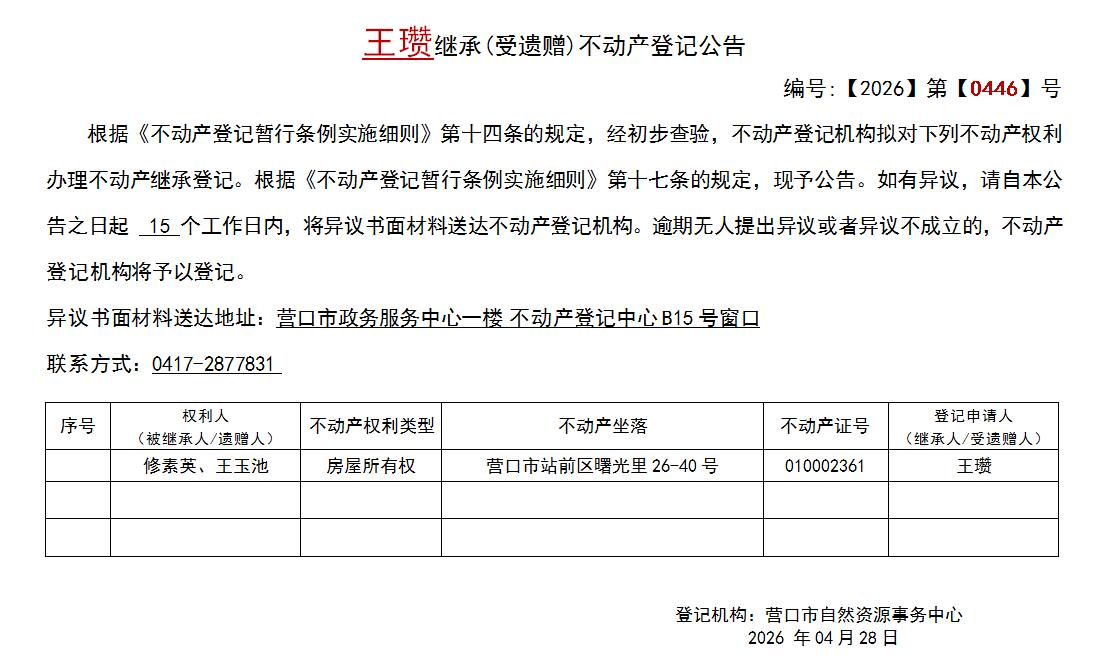 王瓒继承(受遗赠)不动产登记公告-公示公告-营口市不动产登记中心