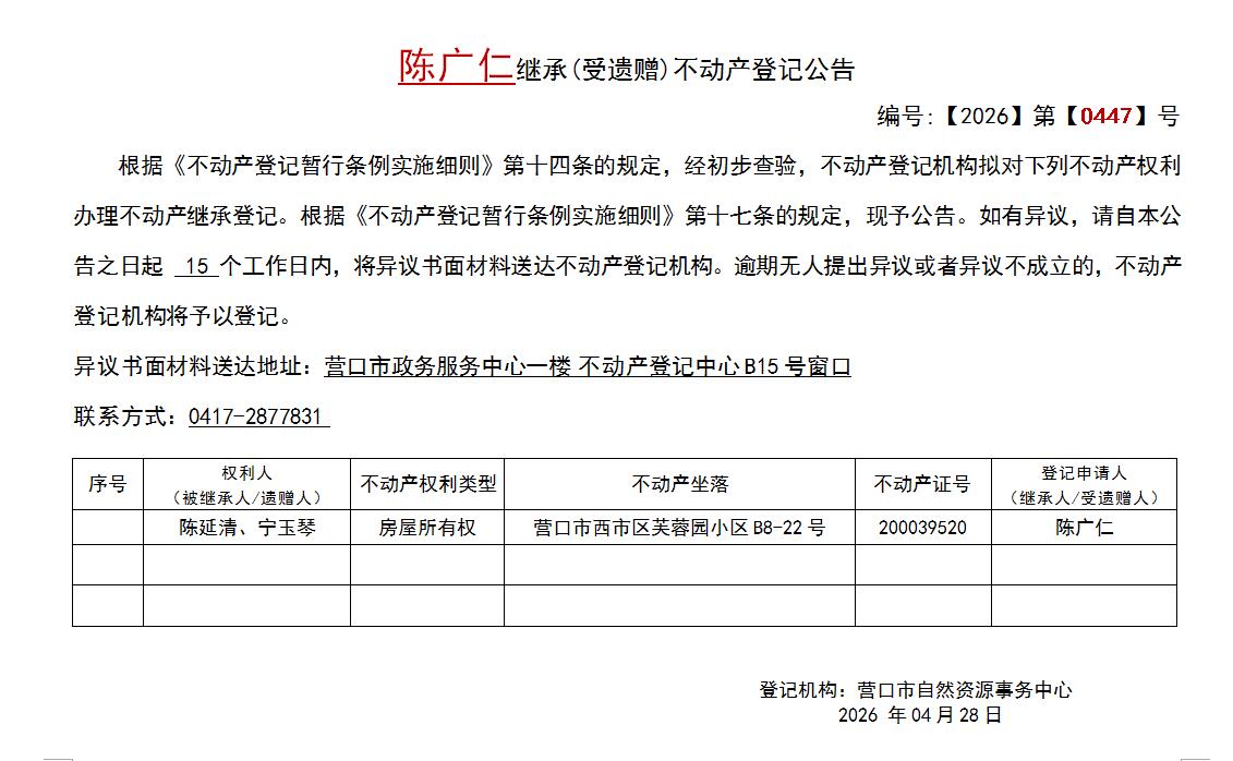 陈广仁继承(受遗赠)不动产登记公告-公示公告-营口市不动产登记中心