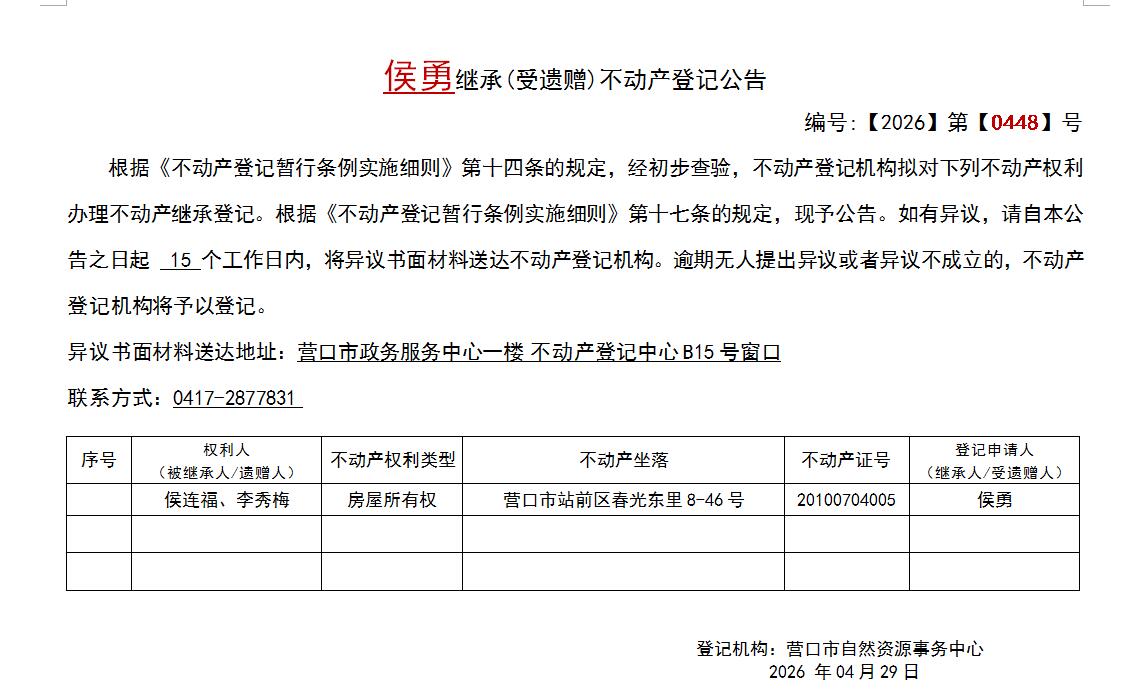 侯勇继承(受遗赠)不动产登记公告-公示公告-营口市不动产登记中心