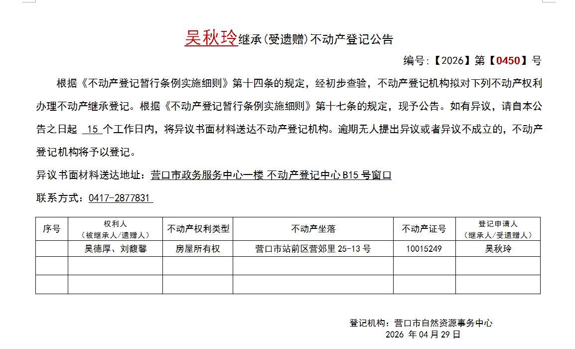 吴秋玲继承(受遗赠)不动产登记公告-公示公告-营口市不动产登记中心