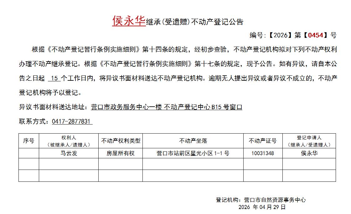 侯永华继承(受遗赠)不动产登记公告-公示公告-营口市不动产登记中心