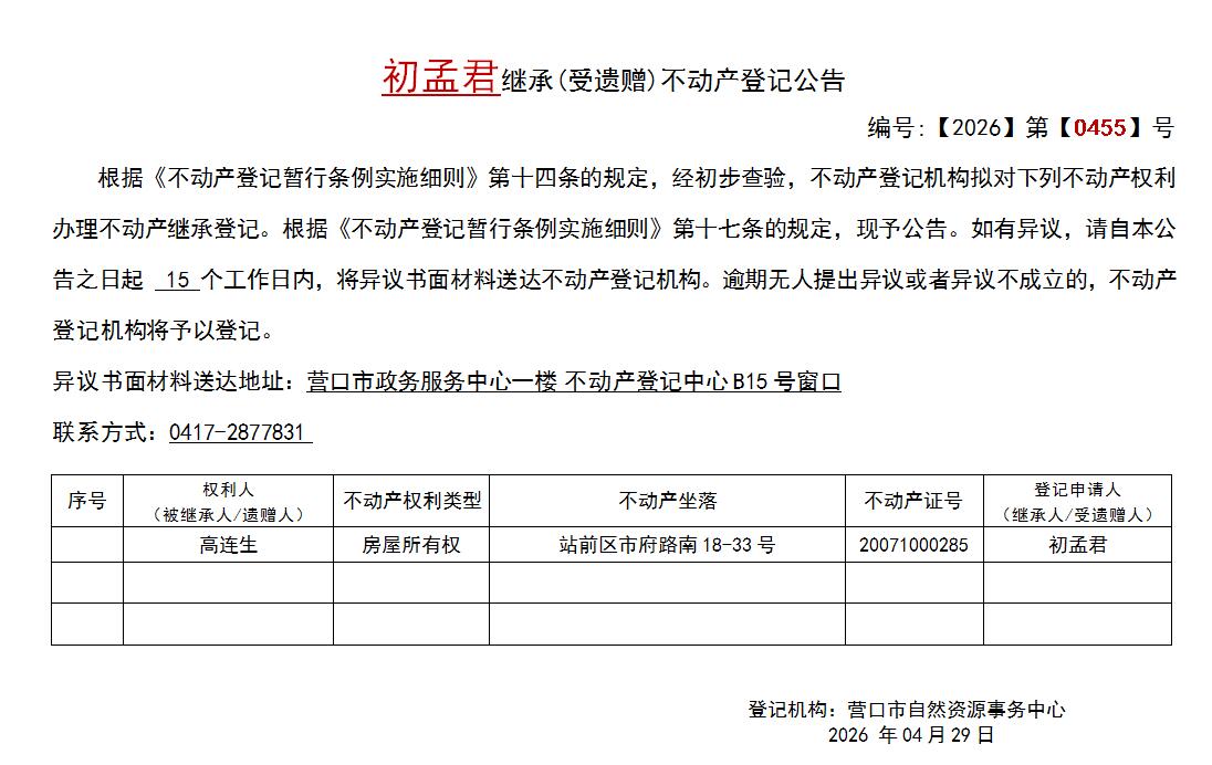 初孟君继承(受遗赠)不动产登记公告-公示公告-营口市不动产登记中心