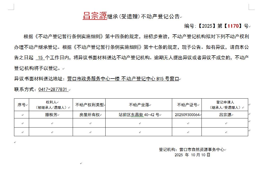 吕宗源继承(受遗赠)不动产登记公告-公示公告-营口市不动产登记中心