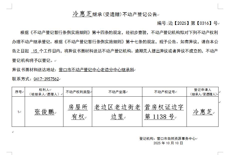 冷惠芝继承(受遗赠)不动产登记公告-公示公告-营口市不动产登记中心