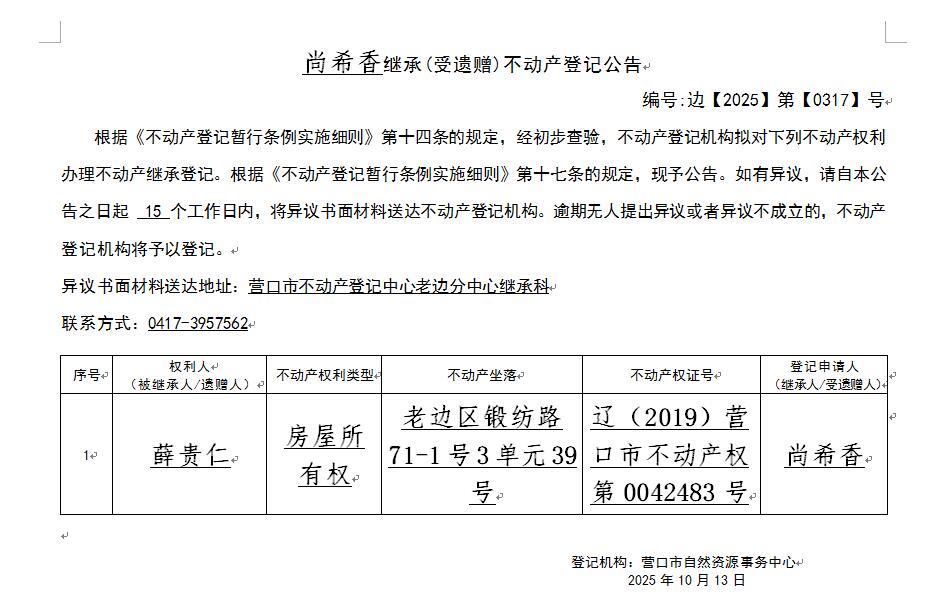 尚希香继承(受遗赠)不动产登记公告-公示公告-营口市不动产登记中心