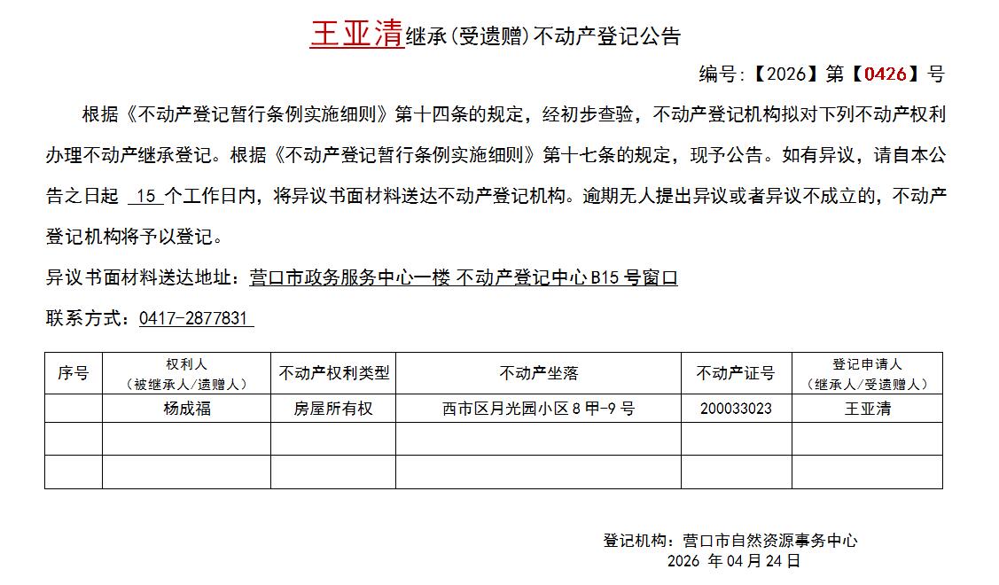 王亚清继承(受遗赠)不动产登记公告-公示公告-营口市不动产登记中心