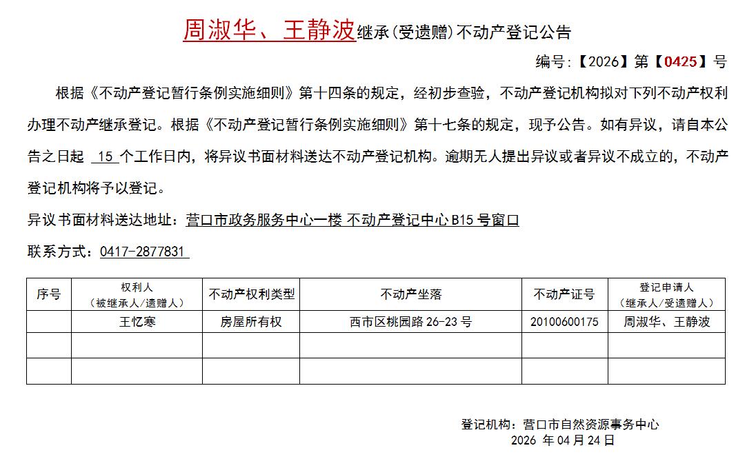 周淑华、王静波继承(受遗赠)不动产登记公告-公示公告-营口市不动产登记中心