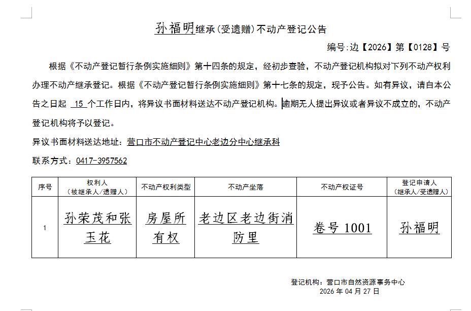 孙福明继承(受遗赠)不动产登记公告-公示公告-营口市不动产登记中心